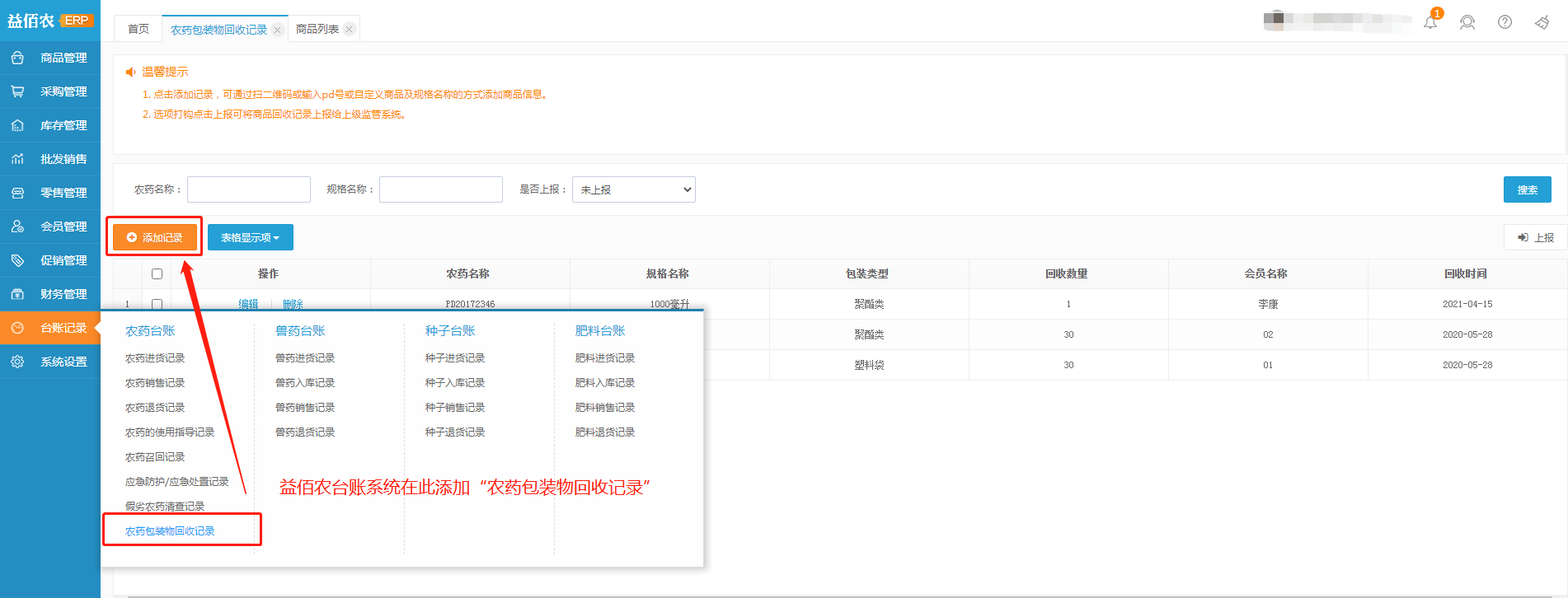 益佰农台账系统在上图标注处添加“农药包装物回收记录”,点击查看大图