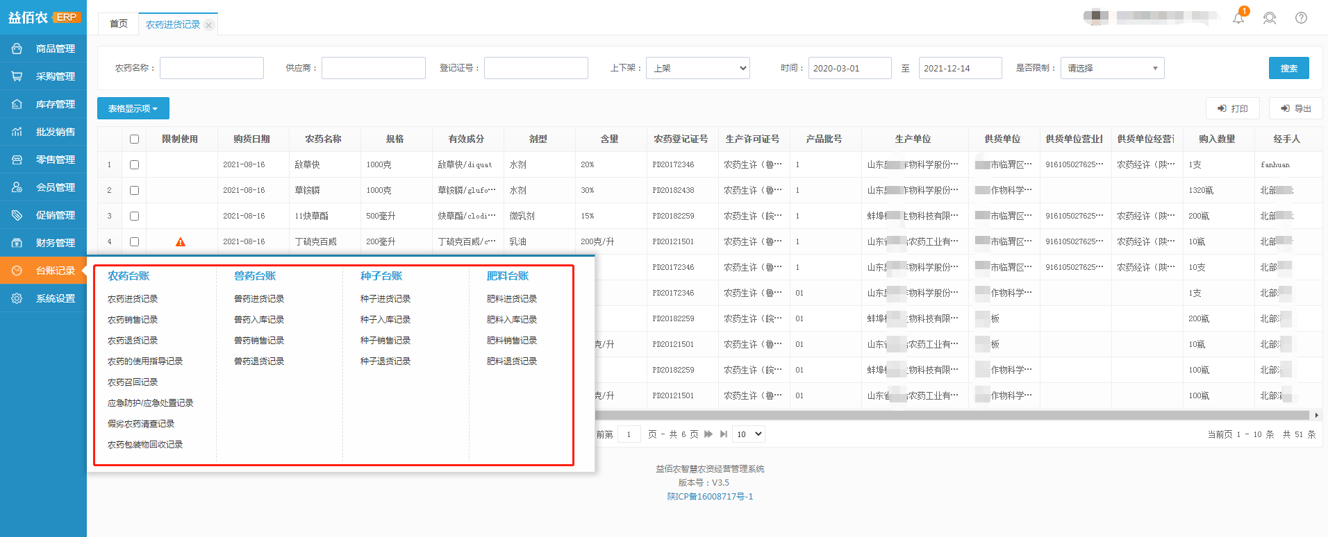益佰农ERP管理系统农药、兽药、肥料、种子等各类台账自动生成,打印导出一键完成。欢迎免费注册
