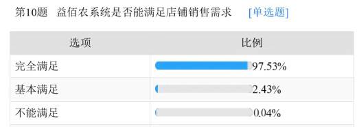 调查结果显示,用户对益佰农系统功能的完整度、适用性,客服服务满意度都非常认可,其中系统满意度占比97.53%,客服满意度占比达到98.14%。