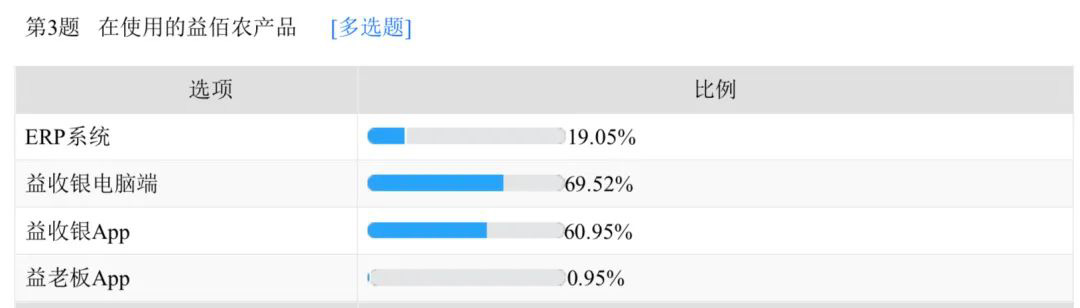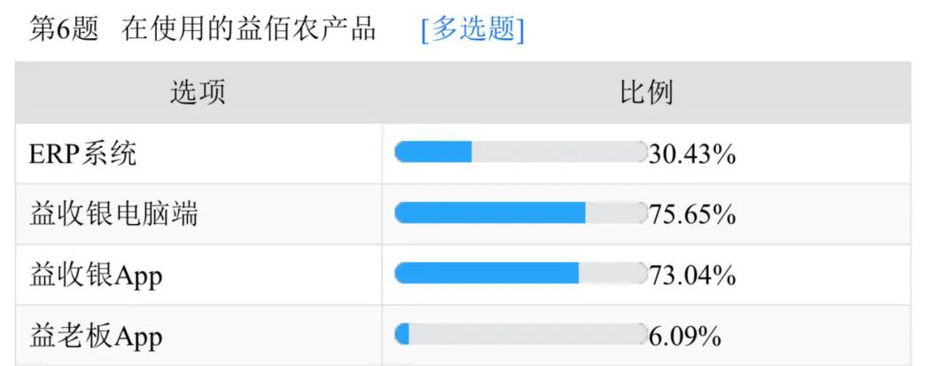 更值得一提的是,对比2020年调研数据,益佰农产品的使用率有较为明显地提升,尤其ERP系统、益收银APP的使用率分别增长了11.38%、12.09%,由此可见,农资经营用户逐渐倾向于更方便、更灵活的手机端应用操作,也更加注重农资进销存管理,农业投入品信息化管理正被市场逐步接受。