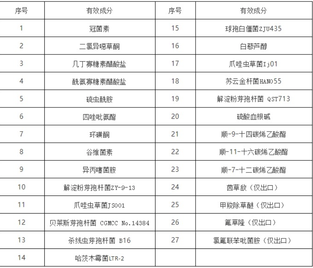 2021年我国获得批准的新农药产品中涉及新有效成分共27种。其中以生物农药为主,化学农药较少,这与当前登记资料要求严苛和生物农药享受较多试验减免有较大关系。新农药批准产品毒性以低毒居多,达28个,微毒10个,中等毒1个,低毒类产品不仅越来越成为企业产品研发的方向,也更容易获得批准登记,2021年登记的农药新活性成分如下图。