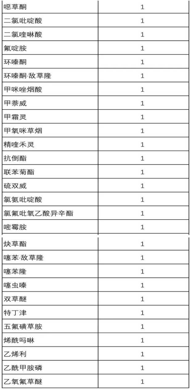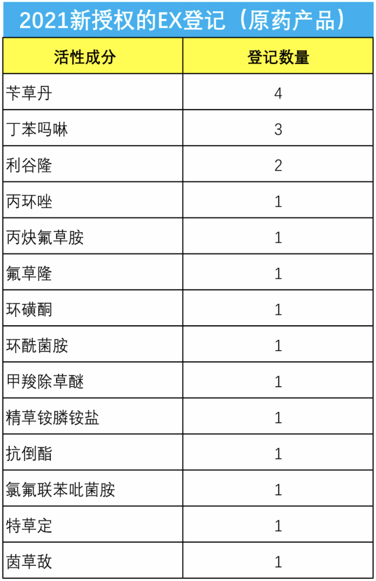 2021年有119个仅境外使用农药获得登记,表明我国农药出口的发展步伐加快。EX登记中涉及原药活性成分14个,具体活性成分如下图。