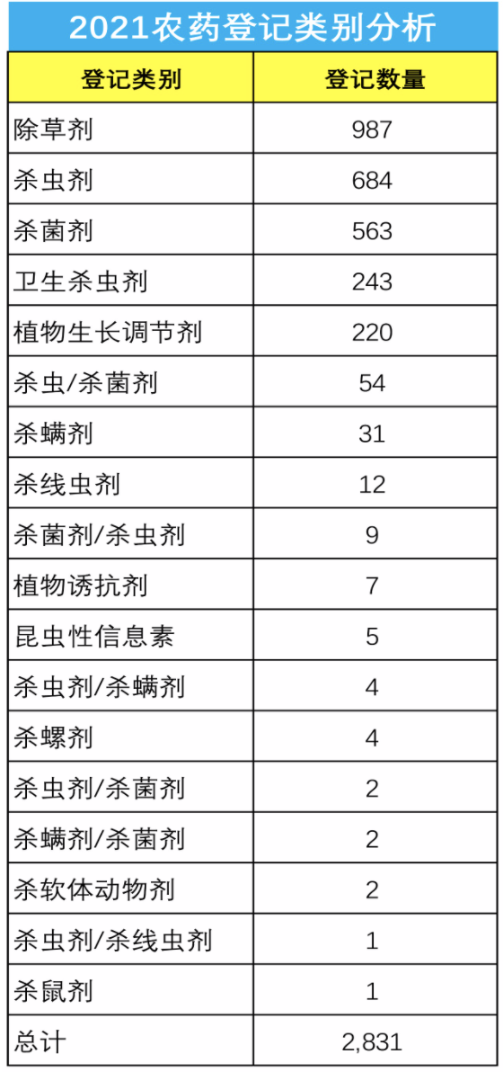 2,831个农药登记中,除草剂产品987个,获批最多;其次是杀虫剂产品,有684个;杀菌剂产品有563个;卫生杀虫剂有243个;植物生长调节剂有220个,不同种类农药产品的登记数量如下图。