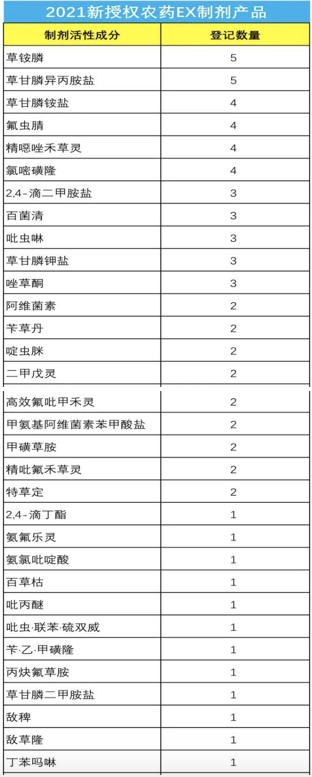 EX登记中,基于草铵膦、草甘膦的产品登记审批最多,氟虫腈、精噁唑禾草灵、氯嘧磺隆位居其后。农药制剂产品的EX登记如下图。