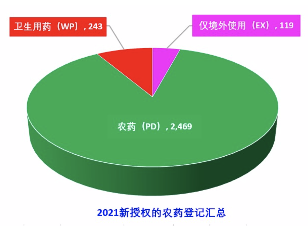 据中国农药信息网数据查询统计:截止2021年12月底,我国共审批农药产品44,719个,其中2021年新审批的农药产品(登记证以PD2021、EX2021、WP2021开头)有2,831个,其中常规农药PD登记有2,469个,卫生用药WP登记有243个,仅境外使用农药EX登记有119个。