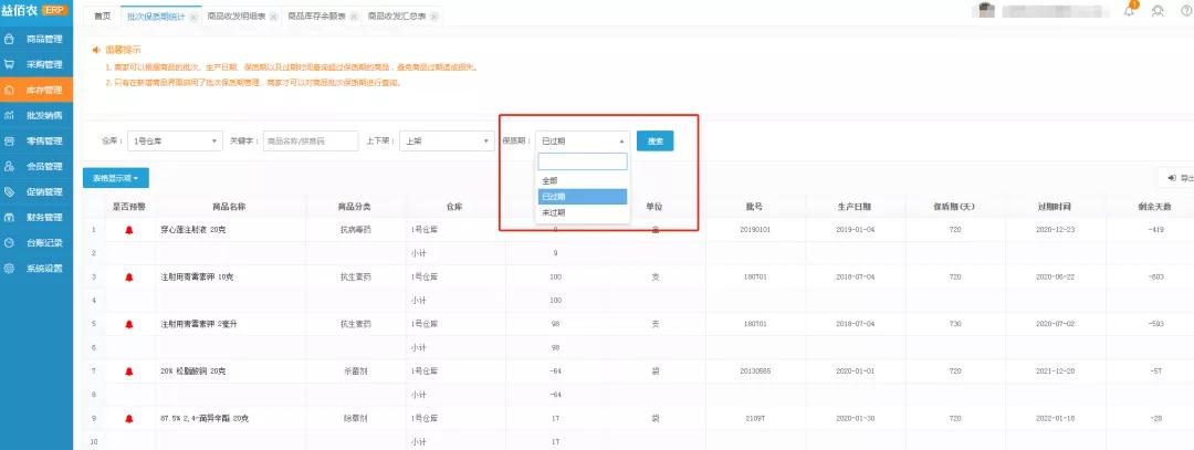 批次保质期统计,可通过筛选项查询已过期的产品信息,避免商品过期造成损失。