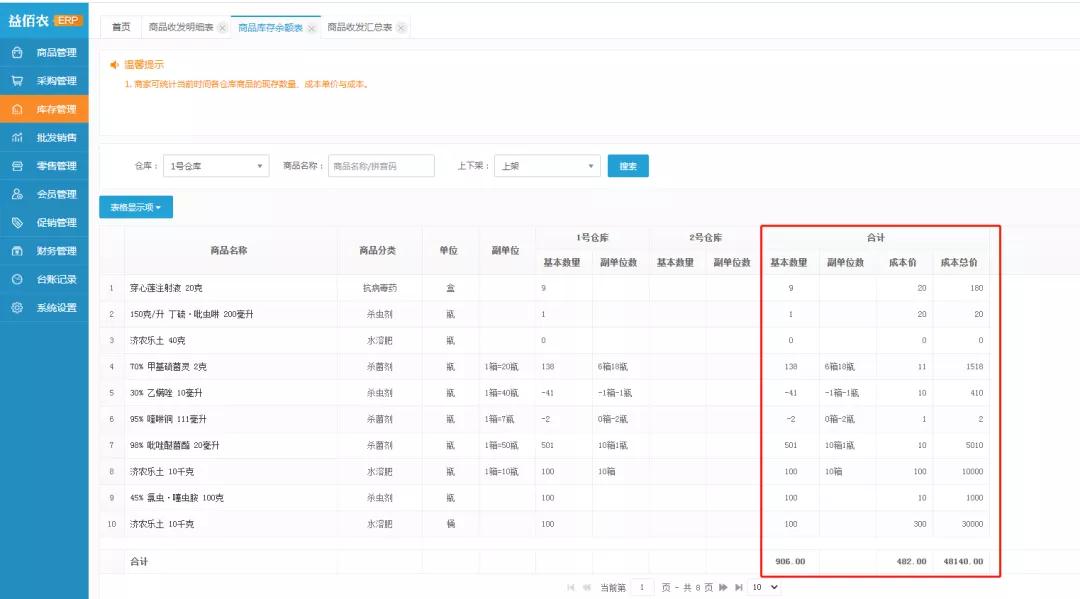 库存余额报表新增列表合计统计功能,商家可统计当前时间各仓库商品的现存数量、成本单价与成本;