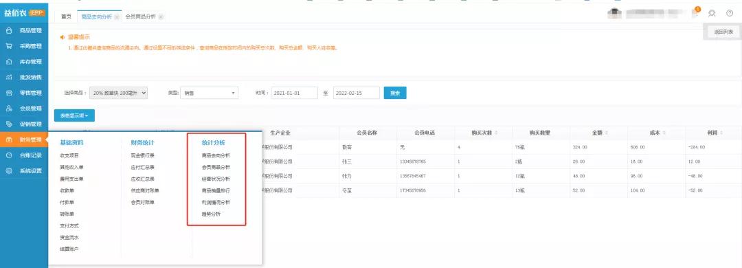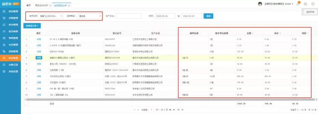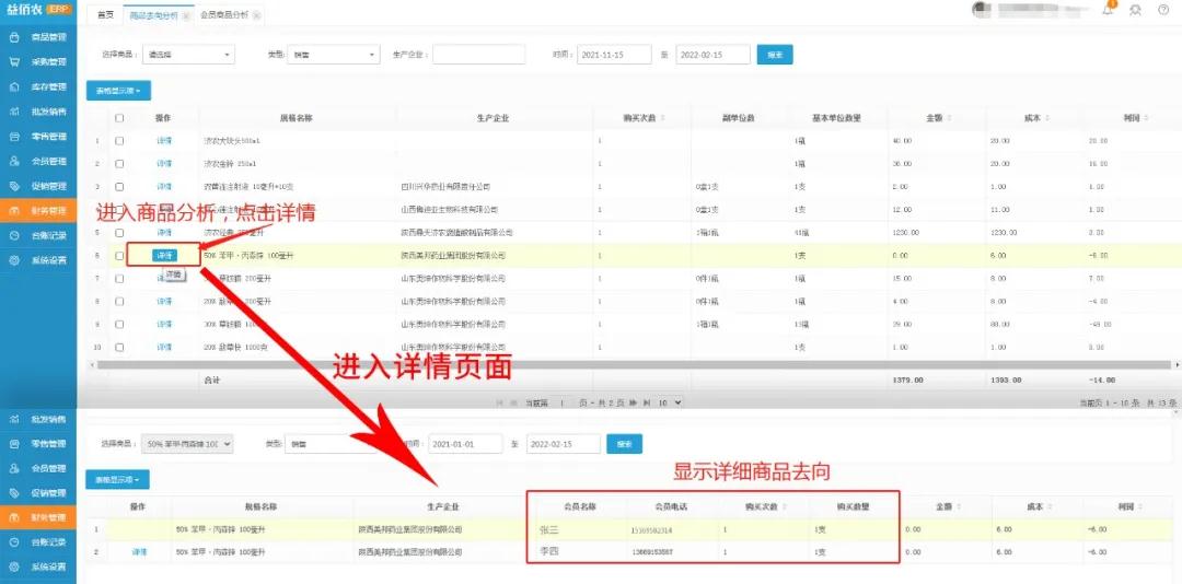 2、会员去向分析:进入会员商品分析页面,点击详情(和商品去向分析步骤相同)可查询指定会员在指定时间购买商品的销售记录,包含商品详情、购买金额、成本、利润等信息;