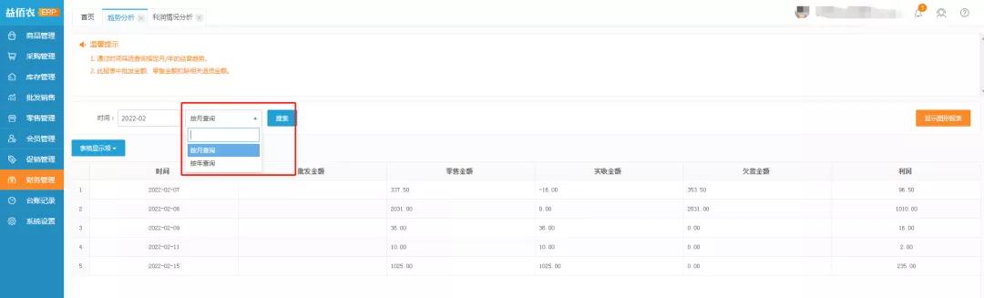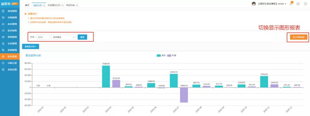 6、趋势分析:此模块可通过时间筛选查询指定月/年的经营趋势,支持切换可视化图形报表查看经营趋势。