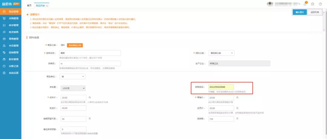 添加肥料、种子、饲料等商品时,规格条码如果为空,系统可随机生成13位规格条码,也支持自定义编辑,方便商品管理。