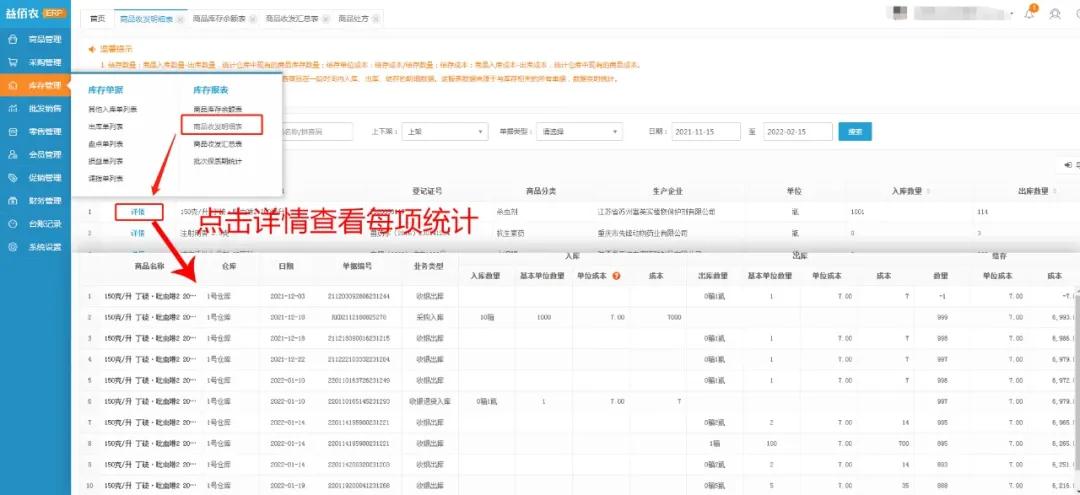 商品收发明细表增加汇总页,商家可以依据各采购进货、销售出库及各库存单据,查询各商品在一段时间内入库、出库、结存的明细数据。