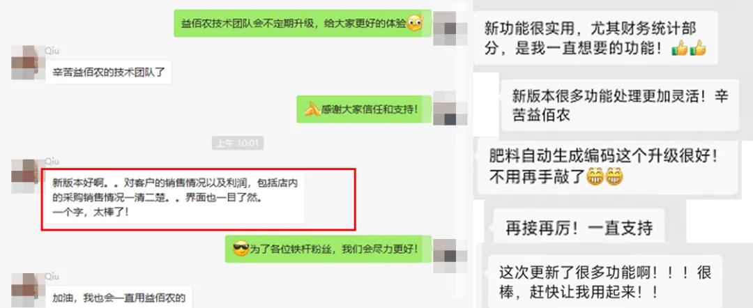 本轮系统升级改版功能多,涉及面广,帮助农资经营户解决了很多经营难题,在系统升级后第一时间,益佰农收到了很多客户反馈,纷纷表示新版本功能很赞!界面显示一目了然!