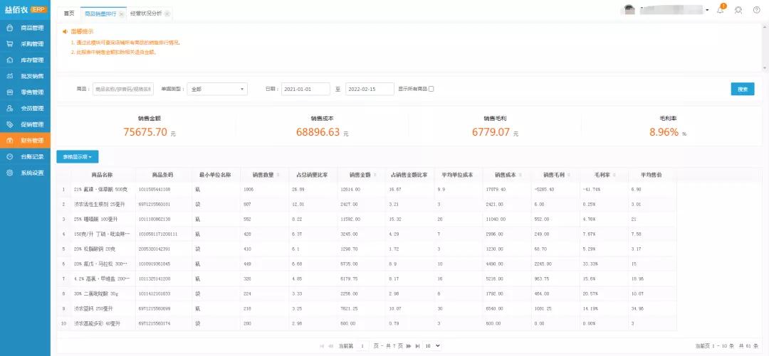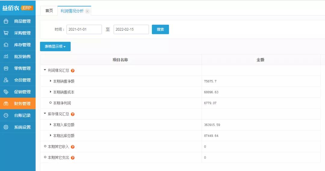 5、利润情况分析:可查询指定时间内利润、库存情况汇总;