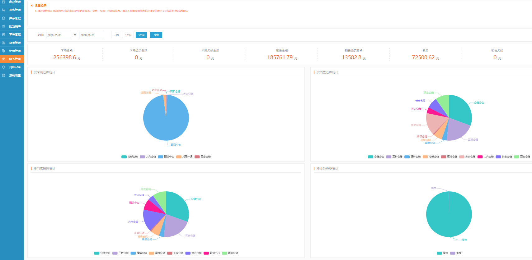 3、经营状况分析:进入经营状况分析页面,可查询经营店铺在指定时间内的采购、销售、欠款、利润等信息,通过不同维度的图表统计清楚的展示了店铺的经营活动情况;