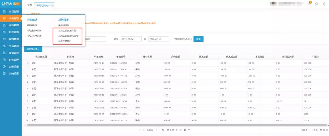 采购报表新增采购付款统计表、采购汇总表(按商品)和采购汇总(按供应商)三大类汇总,统计更精准,查看更灵活。