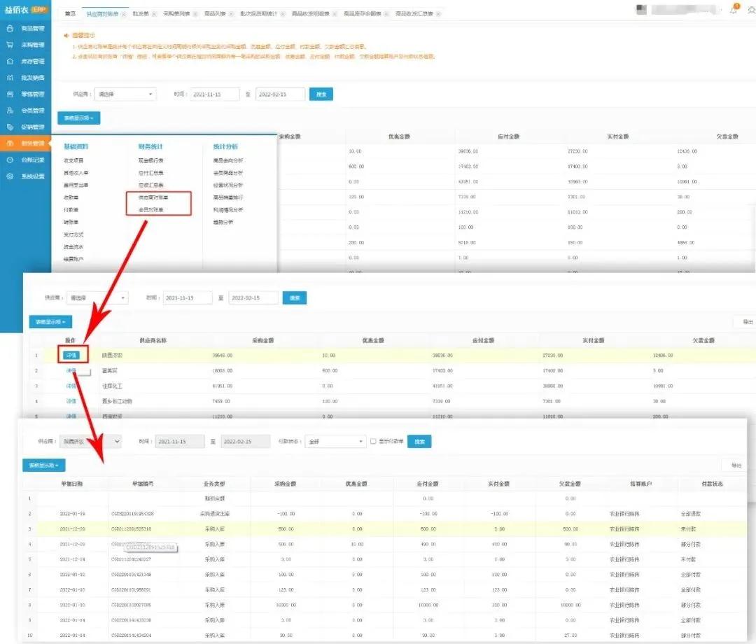 同样操作步骤,点击会员对账单“详情”按钮,可查看单个供应商在指定时间周期内每一笔销售的销售金额、优惠金额、应收金额,已收金额、欠款金额,付款状态信息。