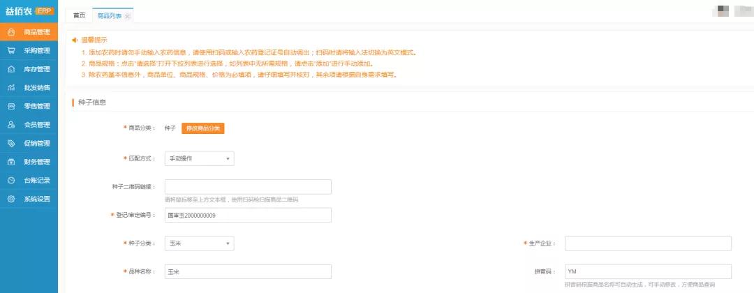 本次主要介绍益佰农ERP后台管理系统新增的肥料、种子、饲料、其它商品自编码功能、财务管理统计分析等功能;同时优化种子添加、处方商品多单位选择、库存明细报表等重要功能。