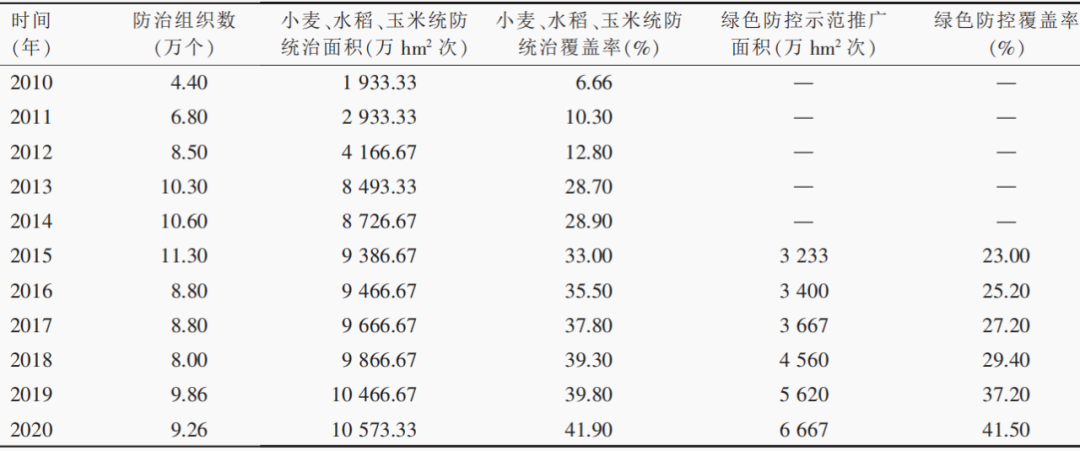 从专业化防治来看,“十三·五”期间,农作物病虫害统防统治专业化服务蓬勃发展,对小麦、水稻、玉米实施专业化防治服务面积达到1.06亿hm2次,全国专业化统防统治服务组织达到9.3万个,三大粮食作物病虫害统防统治覆盖率达到41.9%,比2015年提高8.9百分点,减少了农民自行打药,提高了农药利用率和防治效率。从绿色防控来看,大力推进绿色防控和精准科学用药,及时准确预报病情虫情,推广高效植保药械,推行达标防治、对症用药、适时适量用药。2020年绿色防控面积近6,667万hm2,主要农作物病虫害绿色防控覆盖率41.5%,比2015年提高18.5百分点(表1)。