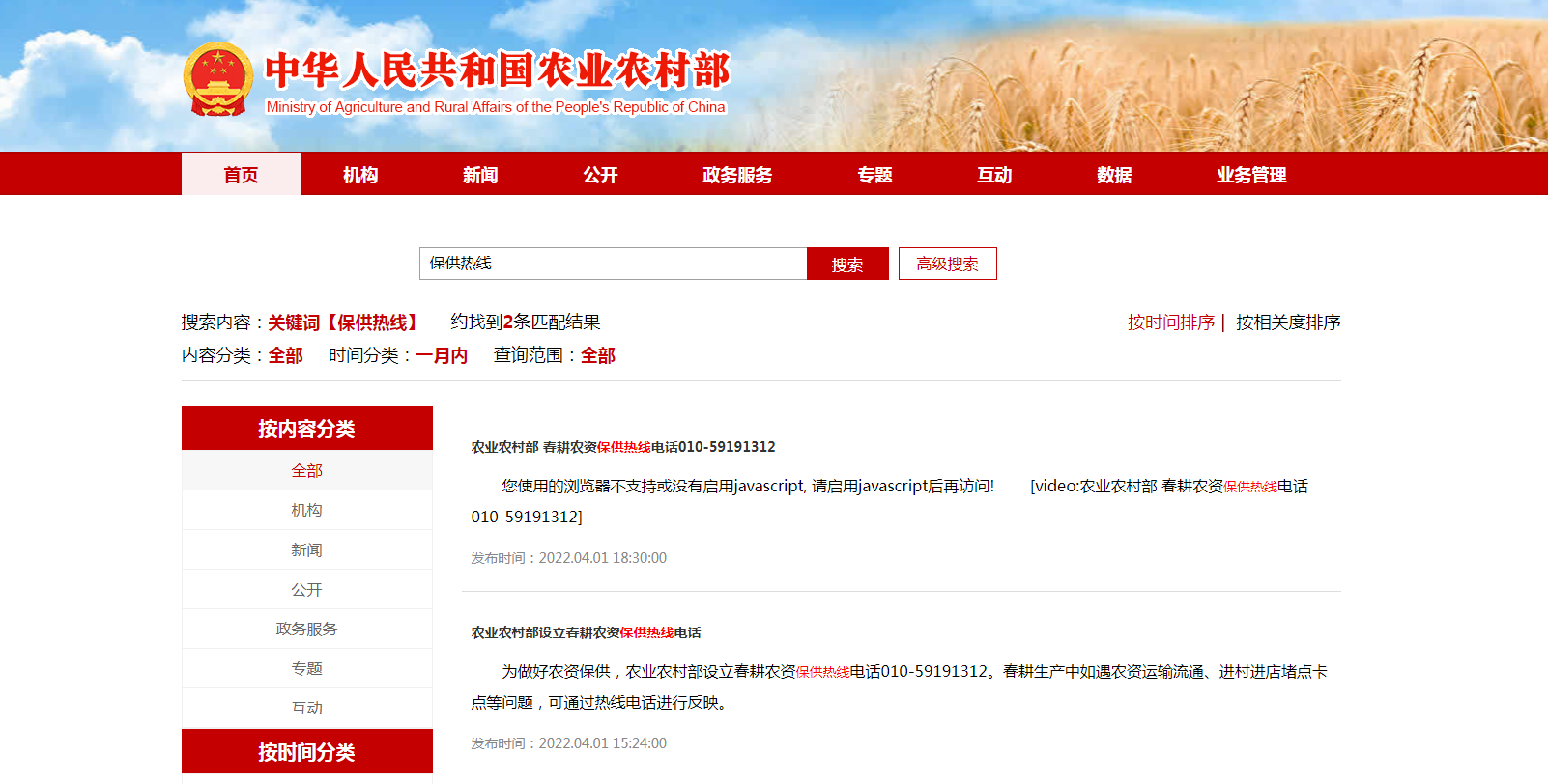 对此,农业农村部设立春耕农资保供热线电话010-59191312。春耕生产中如遇农资运输流通、进村进店堵点卡点等问题,可通过热线电话进行反映。