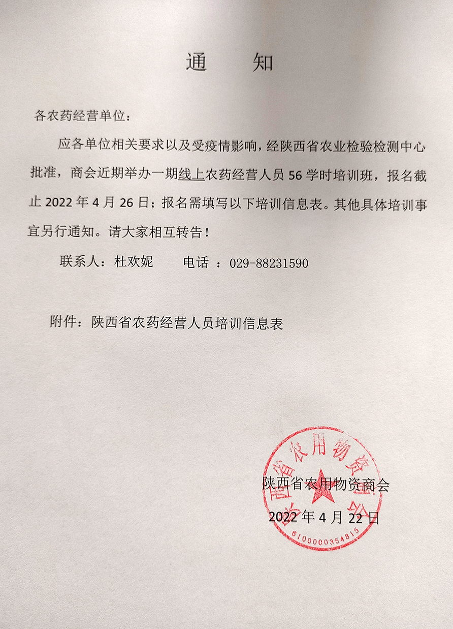 应各单位相关要求以及受疫情影响,经陕西省农业检验检测中心批准,商会近期举办一期线上农药经营人员56学时培训班,报名截止2022年4月26日;报名需填写以下培训信息表。其他具体培训事宜另行通知。请大家相互转告!