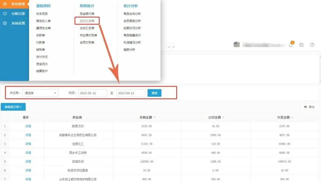 2、应付汇总表:商家可以在此统计所有供应商的应付金额统计。可通过自定义选择供应商、时间段进行查询,清晰了解向供应商采购时的付款、欠款情况。