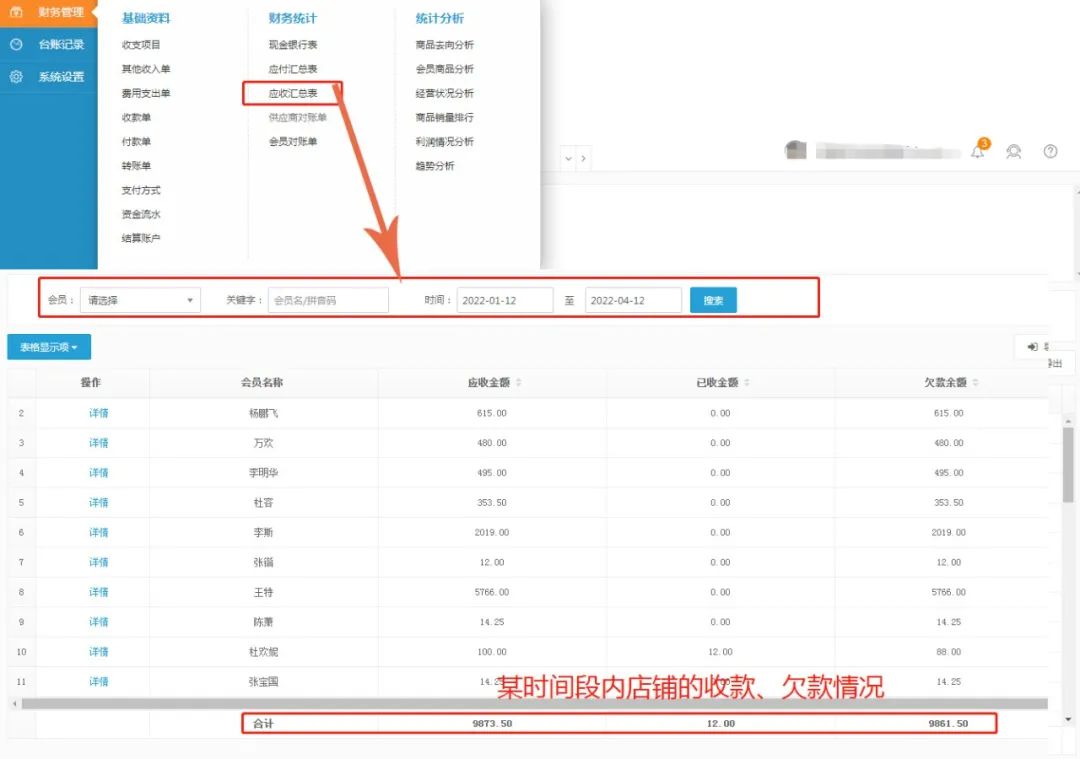 3、应收汇总表:商家在此统计所有客户的应收金额统计。可通过自定义选择会员、时间进行查询,报表同时展示店铺所有客户收款、欠款总计数据。