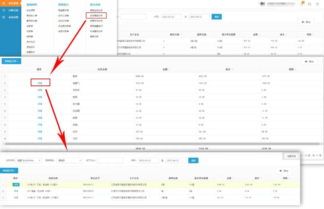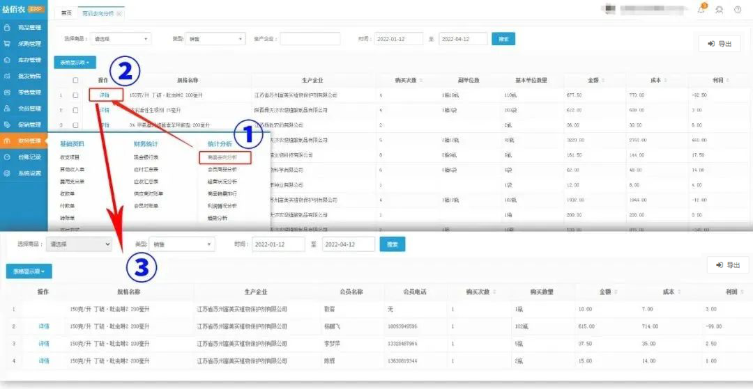 2、会员去向分析:进入会员商品分析页面,点击详情,可查询指定会员在指定时间购买商品的销售记录,包含商品详情、购买金额、成本、利润等信息。