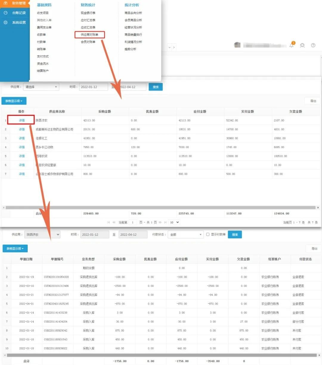 点击供应商对账单“详情”按钮,可查看单个供应商在指定时间周期内每一笔采购的详细状态信息。