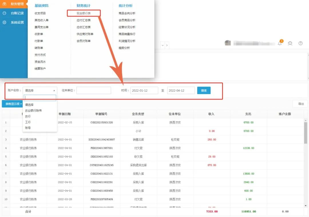 1、现金银行表:用于查询一段时间内各银行账户的收入、支出及结余情况。可通过自定义账户名称、往来单位、时间等搜索条件进行查询。