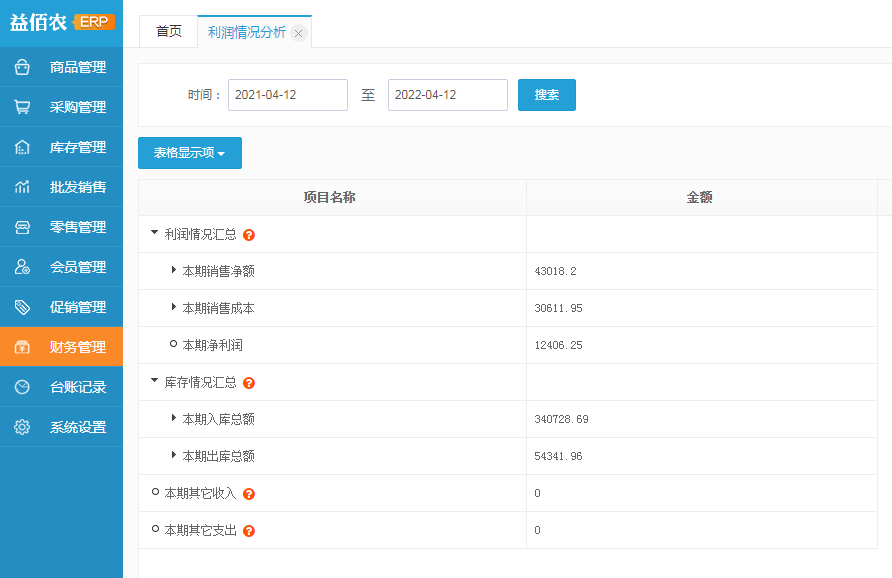 5、利润情况分析:可查询某时间段店铺销售利润、出入库金额汇总。