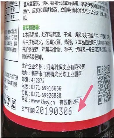 记者在玻璃瓶装的氧乐果产品说明上看到,该农药标注的有效期为2年,而显示的生产日期为2019年3月6日。从包装上标注的有效期计算,记者买到的这瓶农药已经过期了。