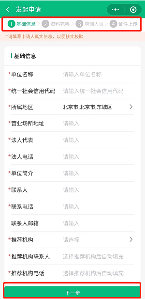 第四步:点击“发起申请”,完善申请单位主体详细信息,点击“确定”;