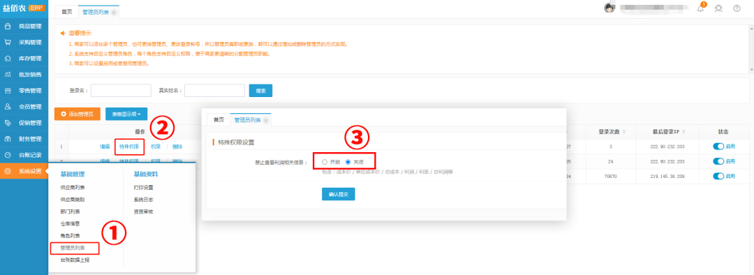 【应用场景】主管理员可设置子管理员是否允许查看利润相关信息,如关闭,子管理员将无法查看库存余额表、商品收发明细详情、订单列表等财务报表利润及成本信息。