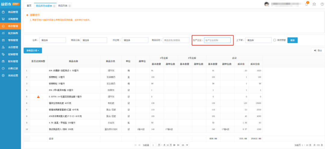【优化】库存管理-商品库存余额表-按供应商搜索功能,新增生产企业(厂家)搜索;