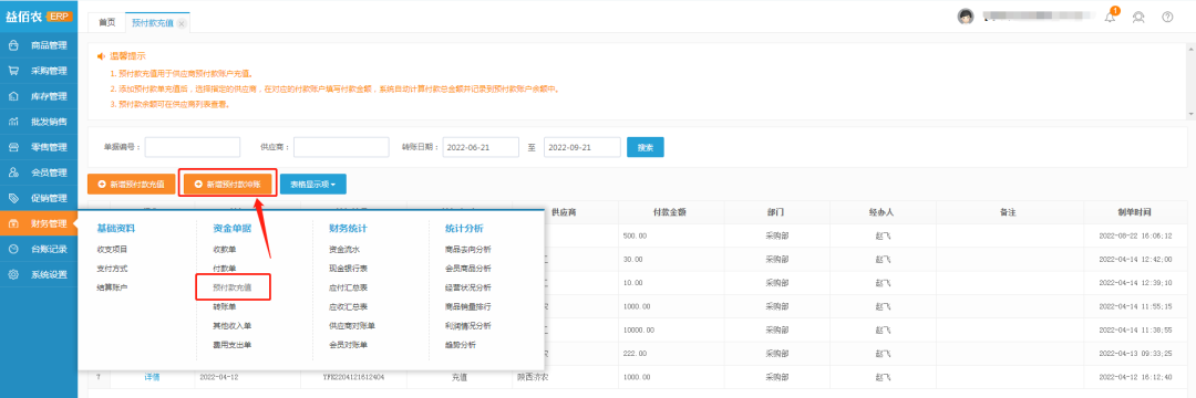 【新增】财务管理-预付款管理-预付款冲账功能;