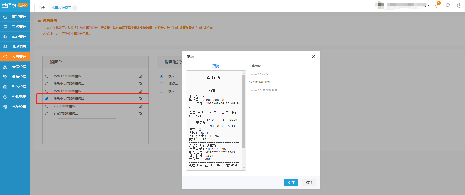 【新增】零售管理-小票模板设置-热敏小票打印机模板四;