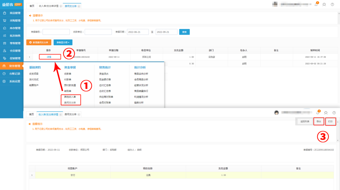【新增】财务管理-其他收入和费用支出导出和打印功能;