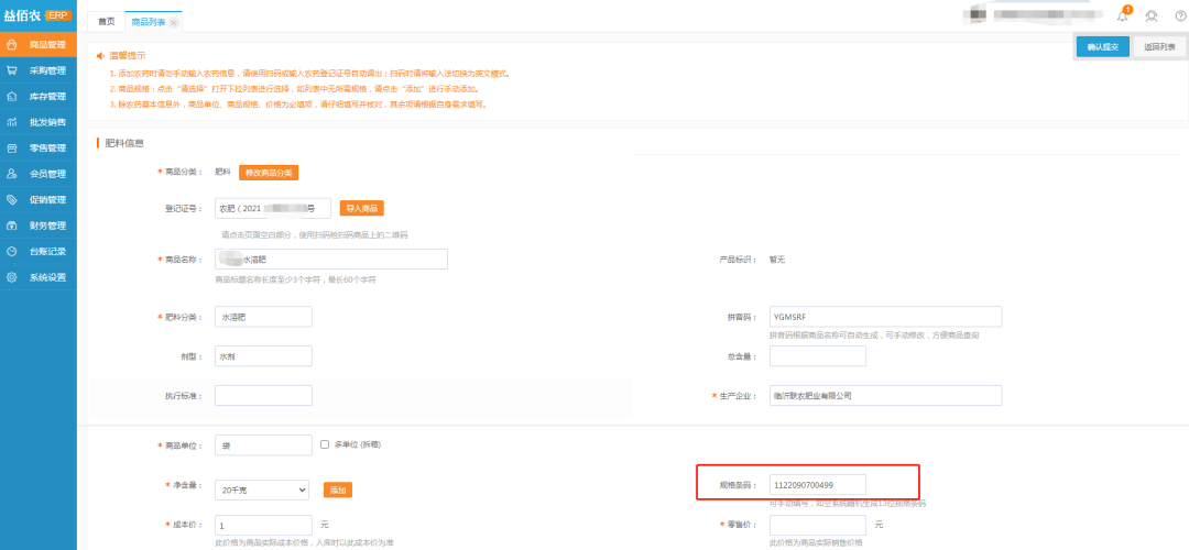 肥料产品无国家统一规格条码。益佰农ERP后台在添加肥料产品时,系统随机生成13位规格条码,方便肥料经营者管理商品,同时也支持手动输入。
