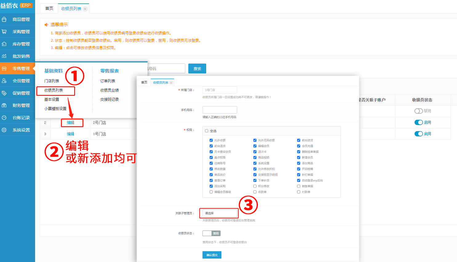 【应用场景】关联管理员后,收银员可按照关联的子管理员身份权限登录ERP后台管理系统。