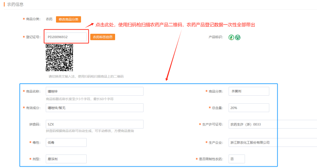 益佰农系统对接“中国农药信息网”数据中心官网数据库。使用扫码枪扫描农药瓶身二维码,农药名称、登记证号、毒性、生产厂家、 生产许可证等登记数据一次性全部带出。