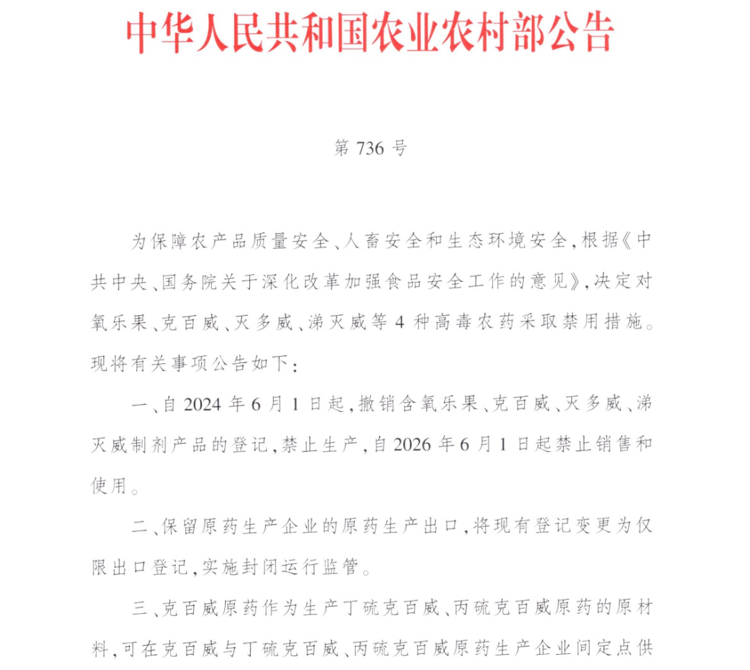 一、自2024年6月1日起,撤销含氧乐果、克百威、灭多威、涕灭威制剂产品的登记,禁止生产,自2026年6月1日起禁止销售和使用。