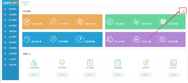 【应用场景】本功能默认隐藏经营利润、欠款、应收金额等敏感信息,适用于将系统界面对外展示场景;如无需隐藏,则打开小眼睛显示数据。