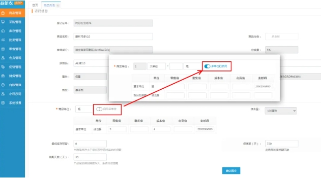 【应用场景】如之前商品单位添加的是单单位(如瓶/袋等),在经营过程中需要变更为多单位(如:一箱=40瓶),那么可以启用多单位,仅支持修改一次,请各位经营户谨慎操作。