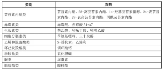 b)植调类:多类芸苔素内酯、苄氨基嘌呤、吲哚丁酸、萘乙酸、三十烷醇、胺鲜酯、赤霉酸、甾烯醇等。