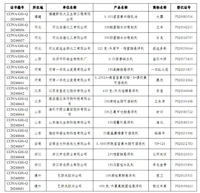 附表:2024年第二批绿色高质量农药产品名单