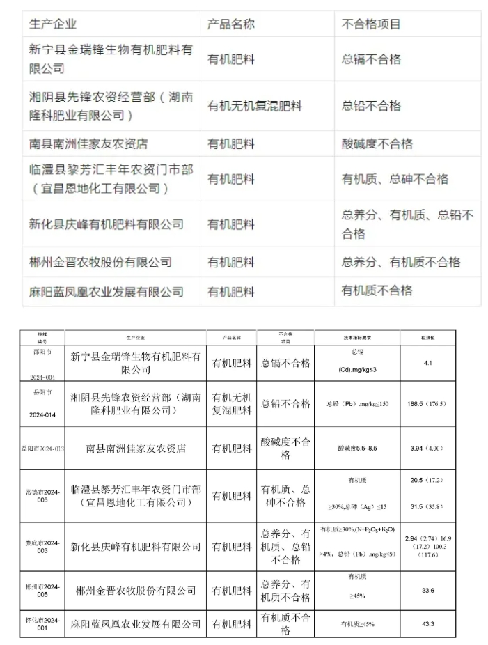 本次抽检的肥料产品质量整体合格率虽然较高,但仍有7家肥料生产企业产品质量不合格,涉及抽检产品中的有机质、养分、水分、酸碱度、重金属等多项技术指标。如新宁县金瑞锋生物有机肥料有限公司总镉不合格等(相关企业名单详见附件2)。