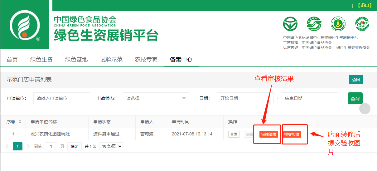 一、进入绿色生资展销平台——点击“示范门店备案系统”;