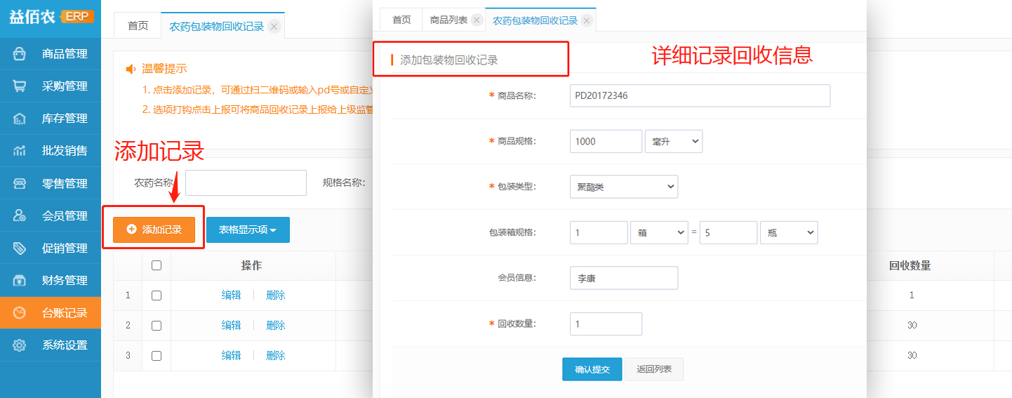 目前仍然采用手写记录的,益佰农智慧农资经营管理系统只需以下几步,即可完成符合国家标准要求的农药包装废弃物回收台账!