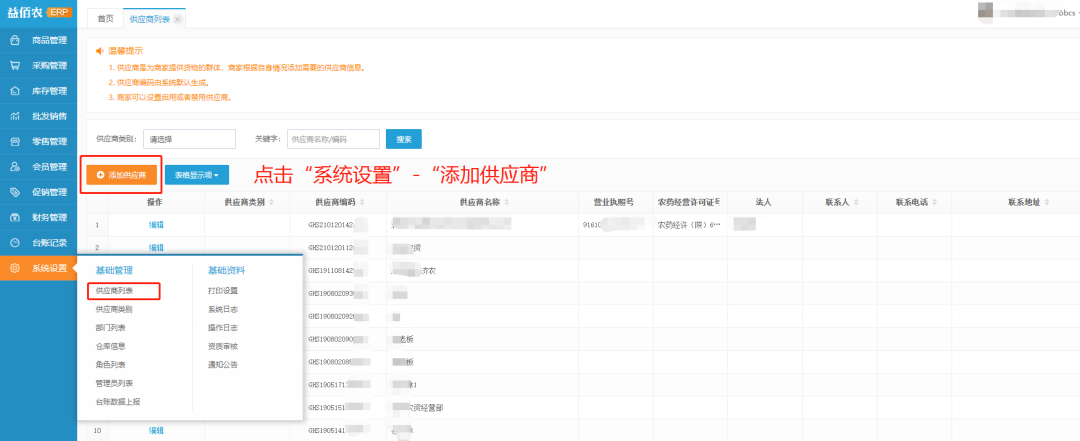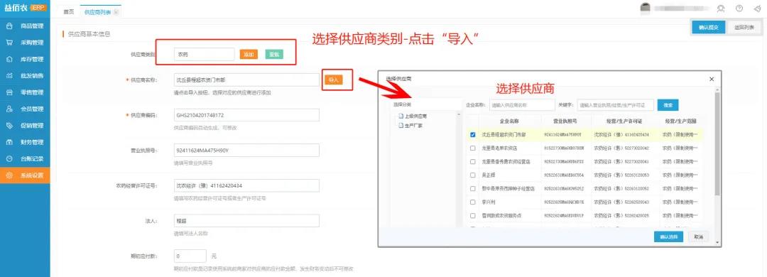为了避免农资经营户采购到违法违规产品,益佰农ERP后台管理系统添加供应商时可搜索全国范围内获得农药经营许可或生产许可的肥料、农药、兽药等农资供应商和生产厂家,一键导入供应商基本信息,具体操作方法如下: