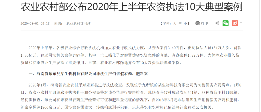 该案被也被农业农村部列入2020年上半年10大农资执法典型案例